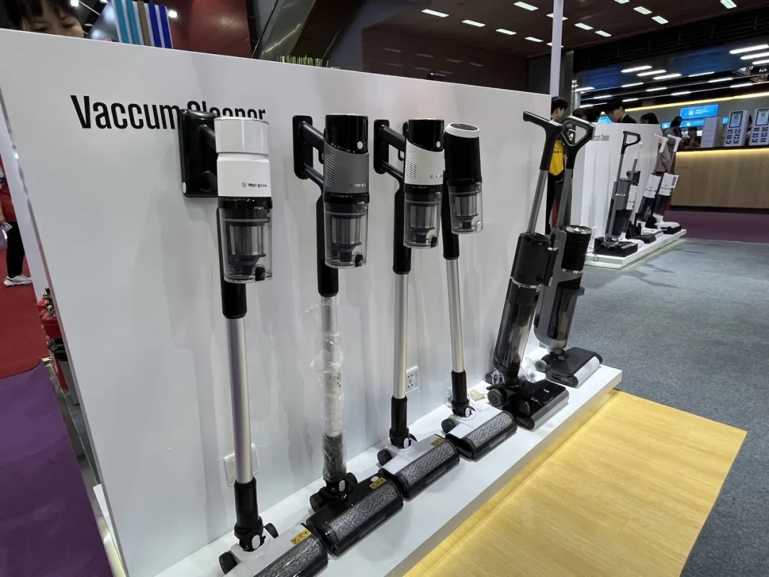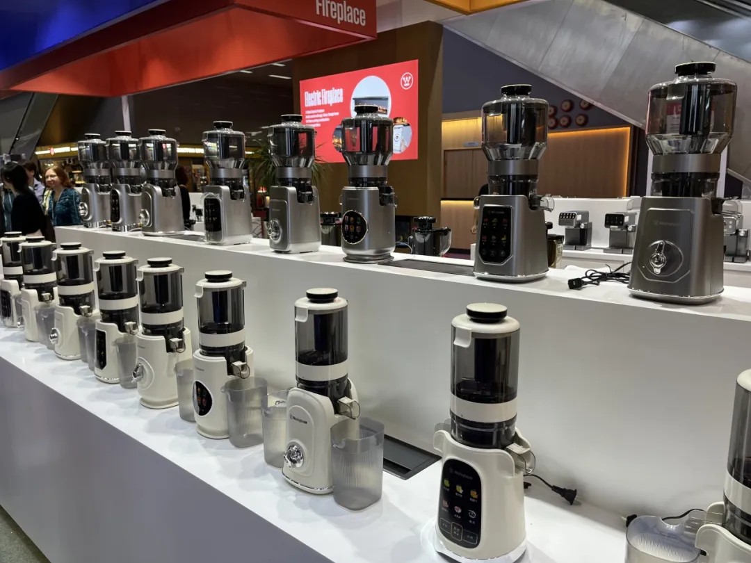 展位内,壁炉、咖啡机、原汁机、洗地机等多款产品整齐陈列,令人目不暇接。